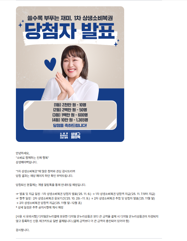 1차 상생소비복권 당첨자 발표 이후, 지급은 2025년 11월 7일부터 순차적으로 진행됩니다.