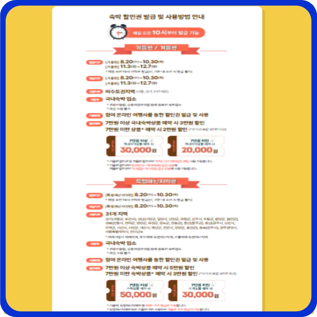 특히 ‘할인쿠폰 다운로드’ 기회를 잘 활용하면 비수도권 숙박을 2만~5만원 할인받을 수 있는 찬스가 됩니다.