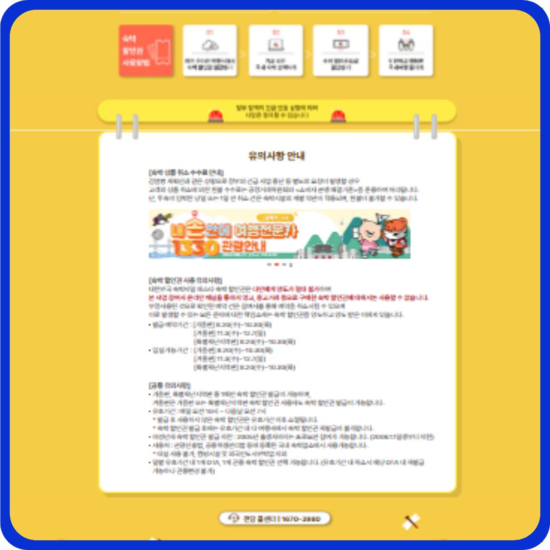 - 숙박요금 7만원 이상 예약 시: 일반권 3만원 할인, 특별재난지역권은 5만원 할인.