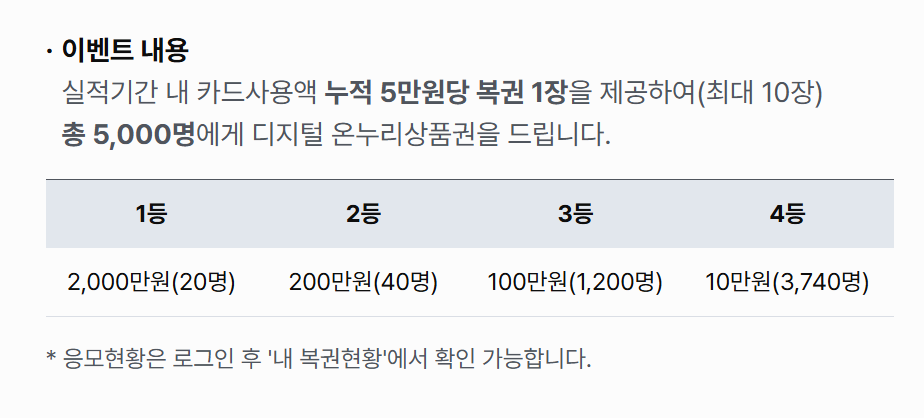 - 응모 기준: 5만 원당 복권 1장, 최대 10장(50만 원까지)